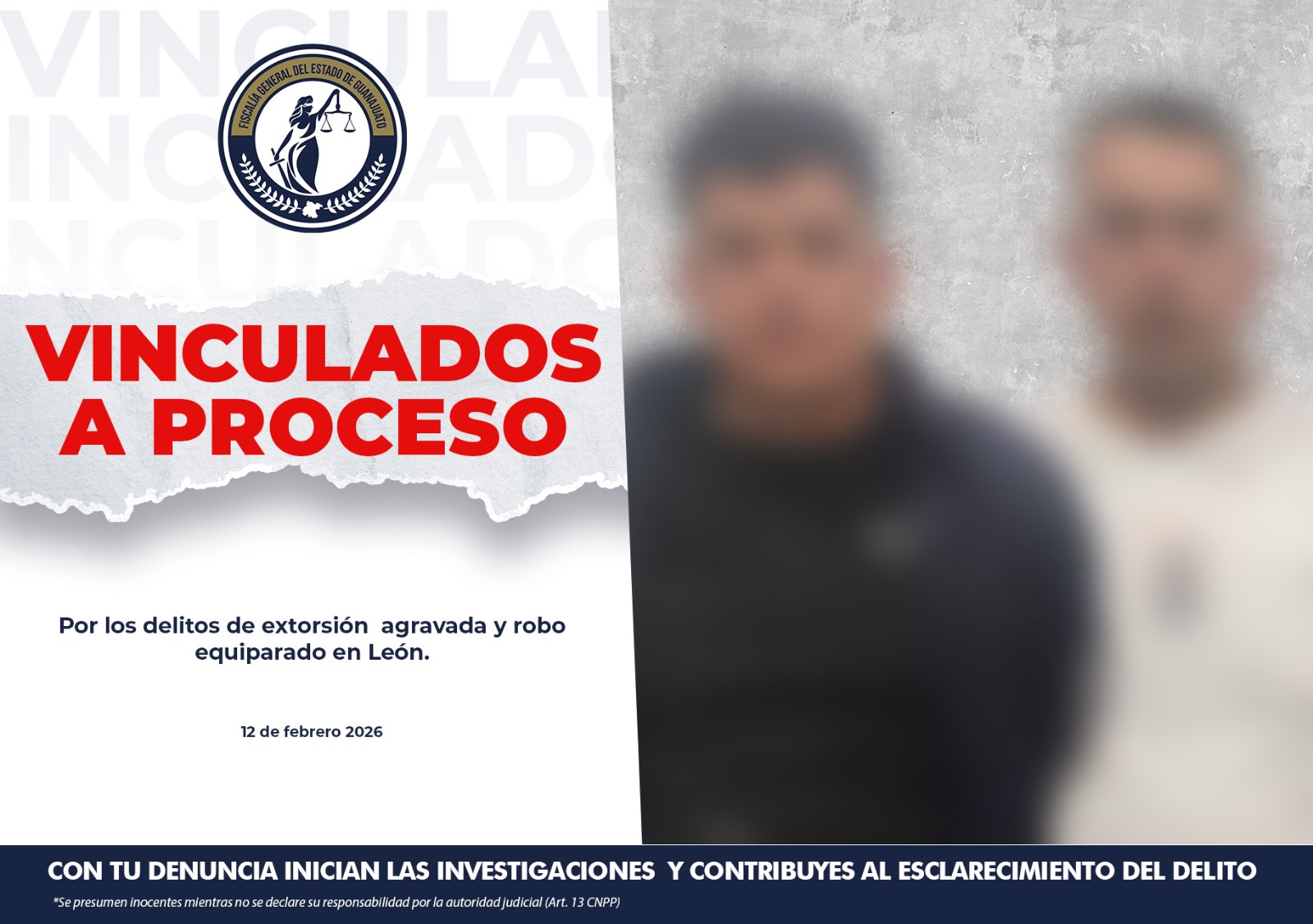 Dos presuntos delincuentes fueron detenidos y vinculados a proceso penal por los delitos de extorsión agravada y robo equiparado. Los imputados, identificados como SERGIO ALBERTO “N” y HUGO CRISTOPHER “N”, fueron detenidos tras un operativo táctico derivado de una denuncia en la ciudad de León.